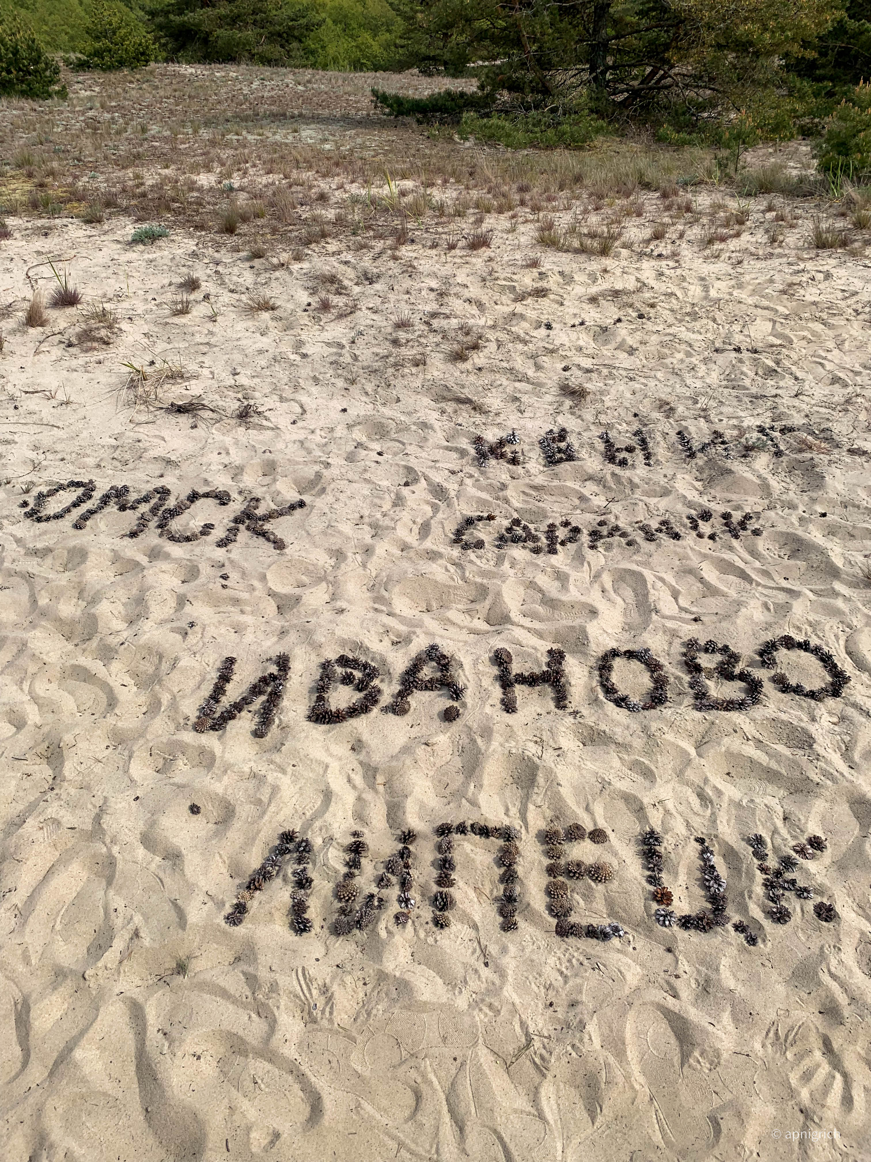 I wasn't the only one stepping off the sidewalks onto the sand. People used pine cones to post their names and the cities they came from.