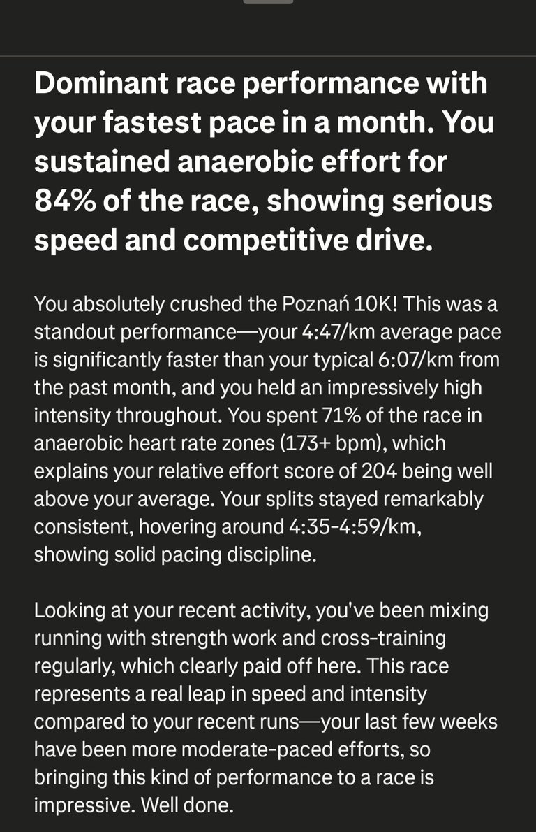 Powrót do regularnego biegania nie był oczywisty, dlatego najważniejsze było po prostu stanąć na starcie i pobiec mądrze. Wynik jest dokładnie w tym miejscu, w którym według prognoz powinien być – zgodny z przewidywaniami algorytmu Garmina i aktualną formą.