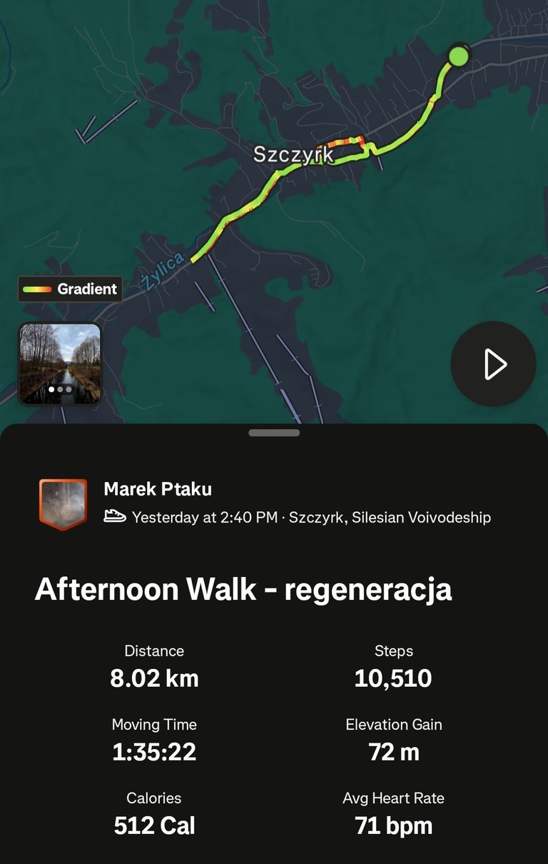 The route in Szczyrk had a clear profile — a steady climb up to around 540 m, then a descent back. Total elevation gain 72 m, natural pace, no pressure.