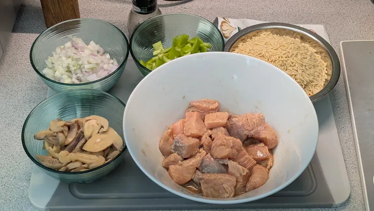 Now everything is ready. The fish has been marinating for a while, the vegetables are chopped, and I've washed the pasta.