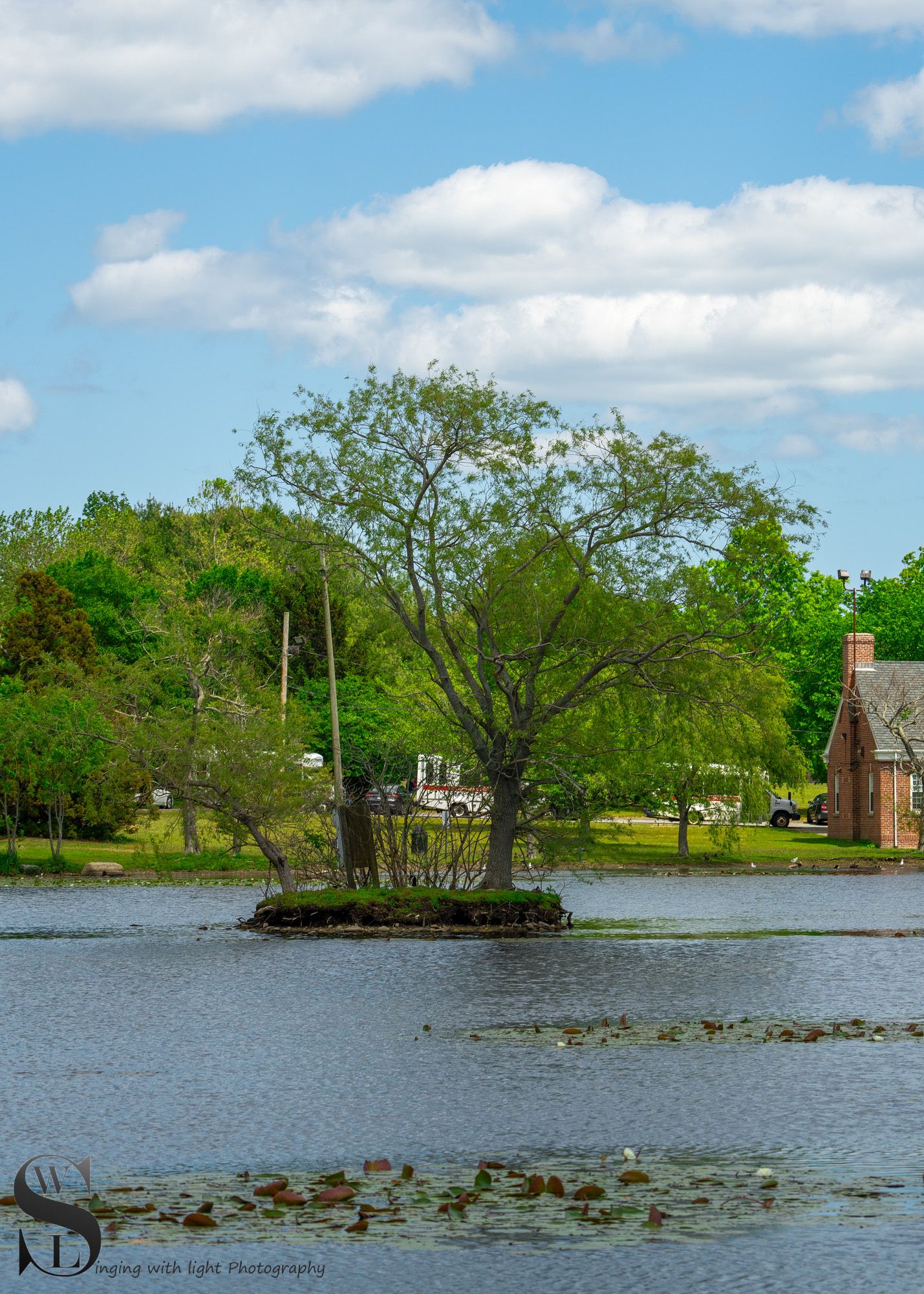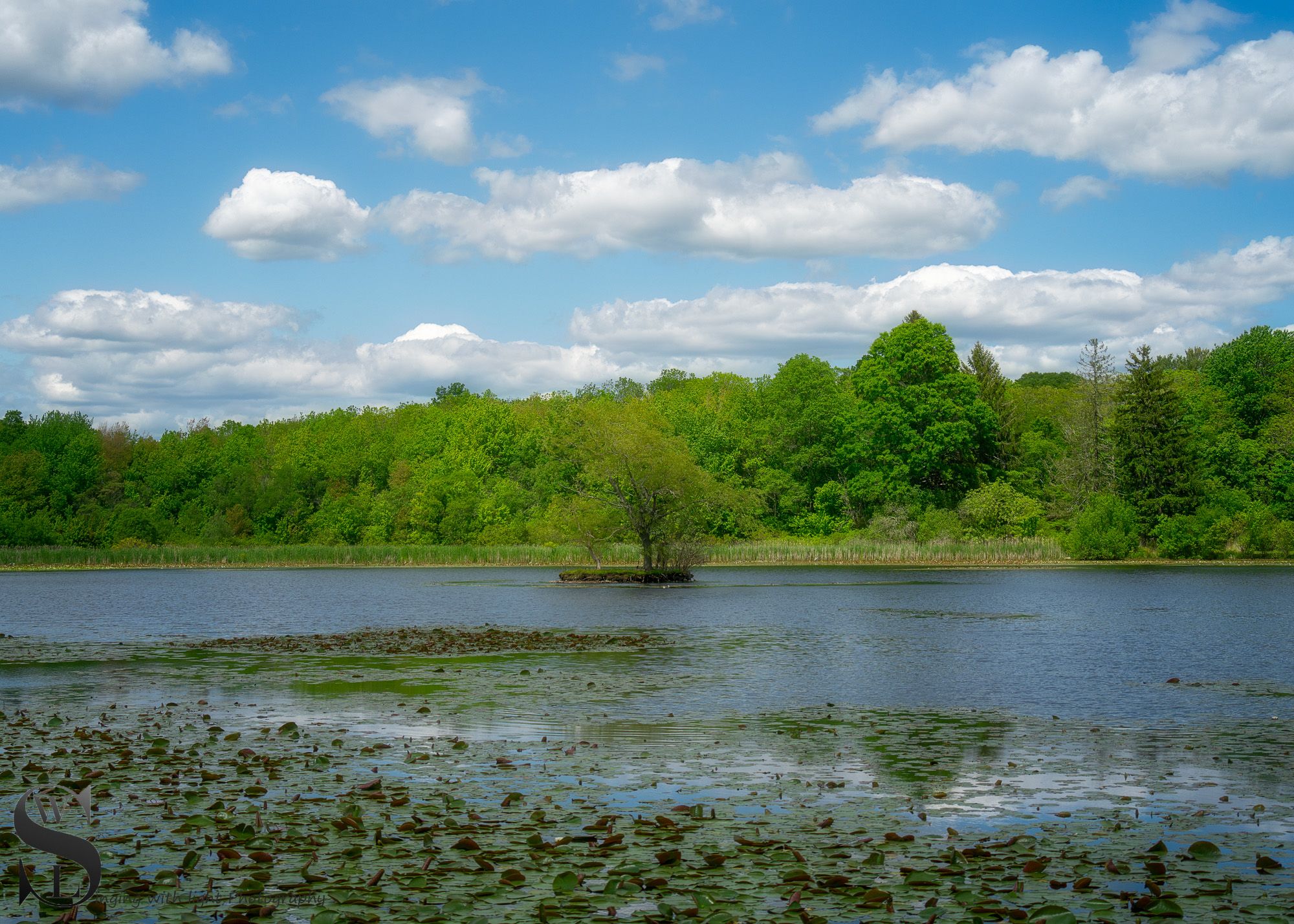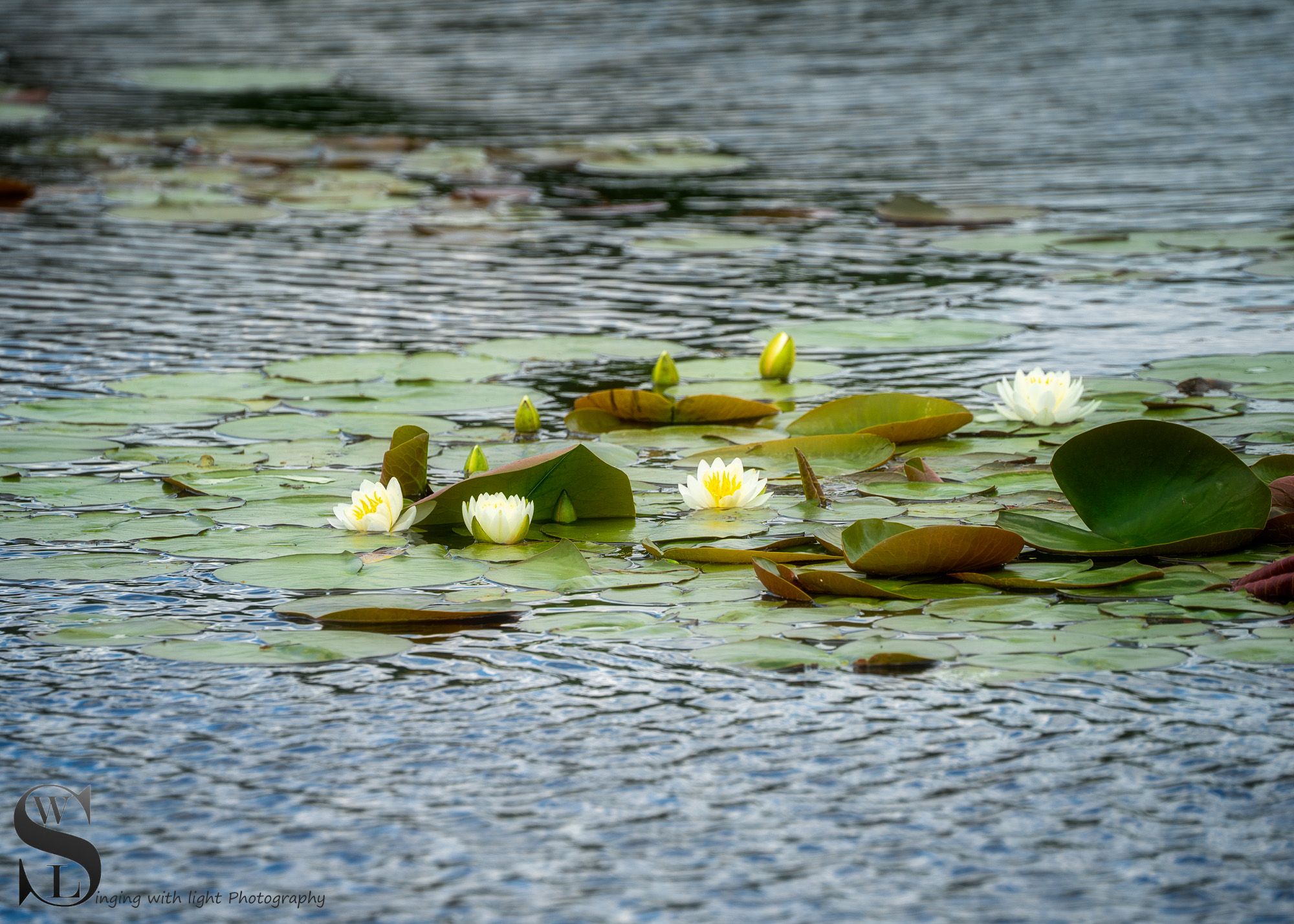 Nice photos. Funny how somethings look so different in tight versus zoomed out. The water lilies close up is beautiful. The green and brown flotsam on the pond not the same. The wider photos are good with the greens on a pretty blue sky just the lilies are no longer the star of the shot.