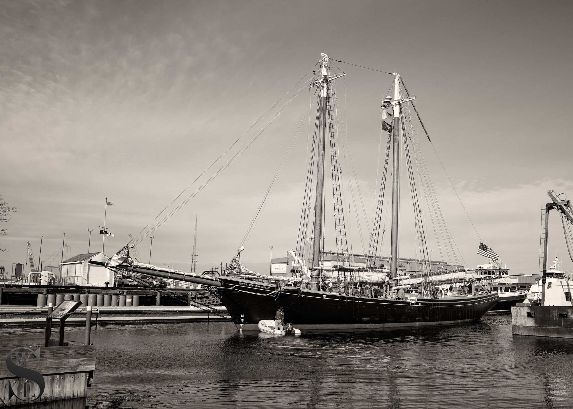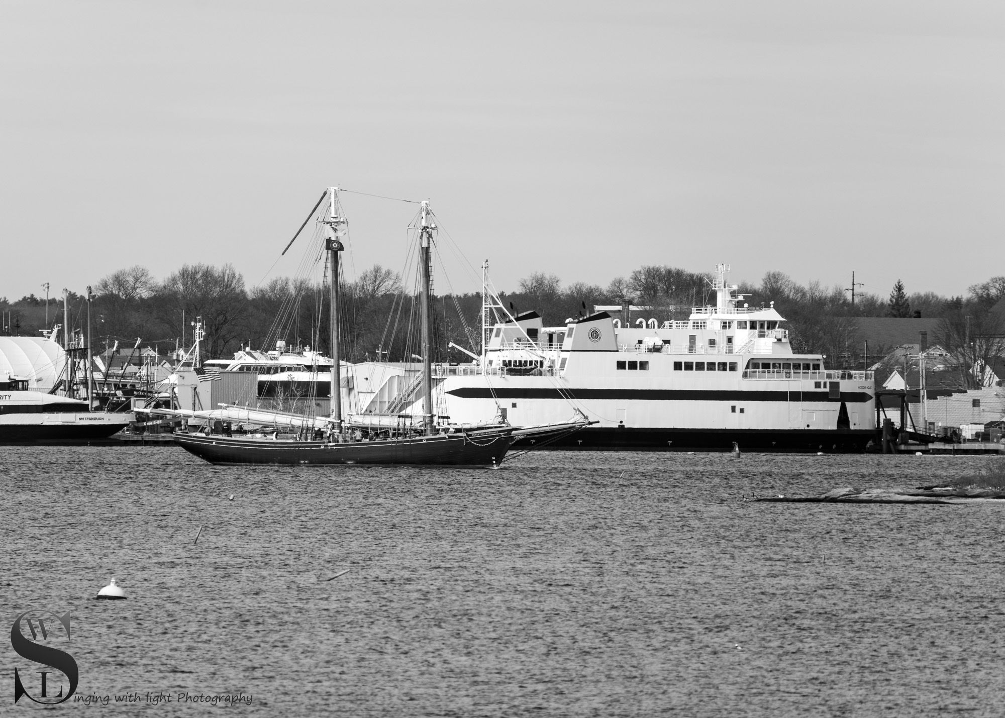 Sony A7iv 28mm F8 1/500 Sec ISO 100 the schooner Ernestina-Morrissey, was built in 1894 at the James and Tarr Shipyard for the Gloucester fishing fleet. Under Captain Bob Bartlett she sailed to within 600 miles of the North Pole, Which I always think is pretty impressive back in those days in such a ship and without modern technology. It was later brought immigrants to the U.S. under the power of sail. Returned to the US in 1982 as a gift from the newly independent Cape Verdean people, she sailed as an educator until 2005. The guy in the small dinghy at the front of the boat gives a sense of its size.  Sony A7iv 51mm F8 1/400 Sec ISO 100 As it pulled put from the docks and was preparing to head out through the hurricane barrier wall gap to open waters  Sony A7iv 28mm F8 1/500 Sec ISO 100 Passing another ship as it heads out  Sony A7iv 400mm F8 1/400 Sec ISO 100 After leaving the port area heading out to the open waters, it got to this spot and I was hoping it would raise its sails and sail away but it sat at this spot for ages and I eventually gave up and headed home  Sony A7iv 400mm F7.1 1/250 Sec ISO 100 And one last shot out of order of it in the port  Sony A7iv  18mm F8 1/500 Sec ISO 100 !pinmapple 41.635944 lat -70.920507 long the Port New Bedford MA d3scr