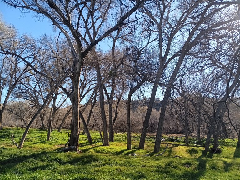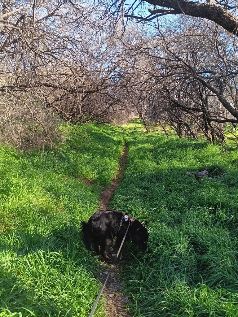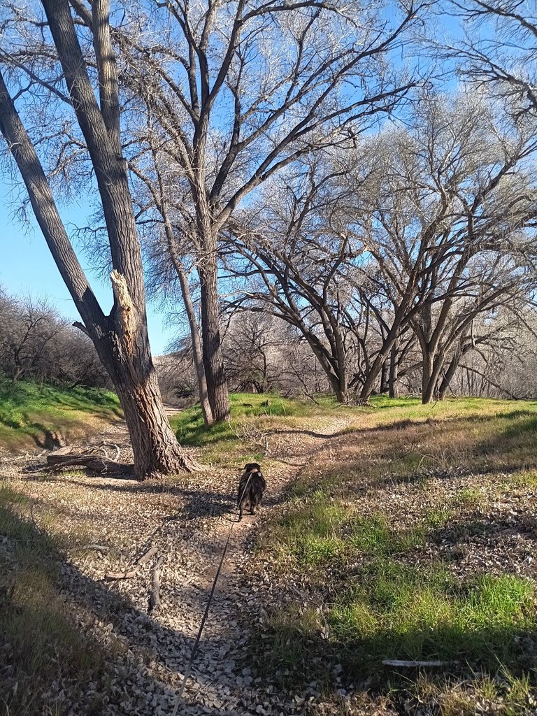 Plenty of green grass for Lulu to check while there were plenty of birds up in the massive cottonwood trees lining the river channel.